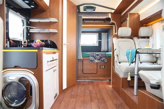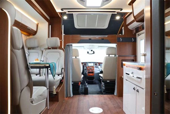 车身内部采用北欧风格的装饰,明亮、简约、大气。车厢中部为会客区,会客区采用对坐式卡座沙发设计,北欧风格的室内设计理念,搭配一张可升降式餐桌,临时可拼成一张沙发床,提供了更多的休息空间。会客厅上方有着一排储物吊柜,方便日常使用。后方则是一台152L赛特福德房车专用冰箱,用以存储食品,排气扇进一步增加了车内的空气流通性。顶部氛围灯营造出了温馨的家庭氛围。