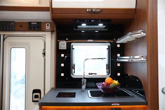 厨房区的配置有微波炉、进口洗菜池、156L进口赛特福德冰箱、800W一体式电磁炉、车载抽油烟机等,足以满足日常烹饪需求;厨房顶部与下方分别设有储物柜,可用来放置一些日常用品;厨台的侧面位置配有进口大宇洗衣机;