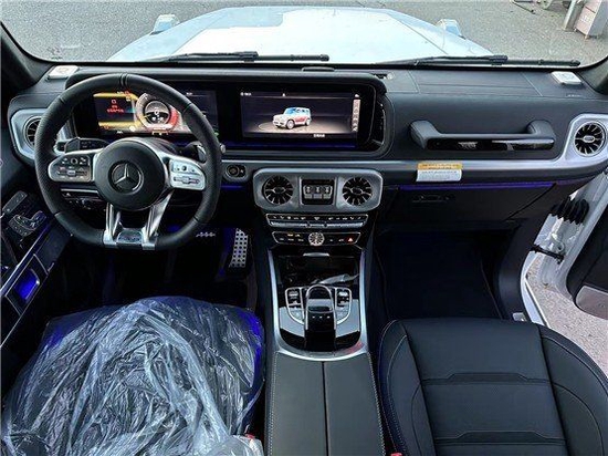 23款奔驰G63豪华精致的真皮包覆提供了足够的舒适性和支撑性,通风和加热功能让乘客免受高温和寒冷的煎熬。中控台多处均采用碳纤维材料覆盖,带彩色TFT显示屏的AMG仪表盘、AMG主菜单和单独的挡位显示器以及采用白色照明的AMG门槛。名贵的选材及精湛的内装令人拍案叫绝。