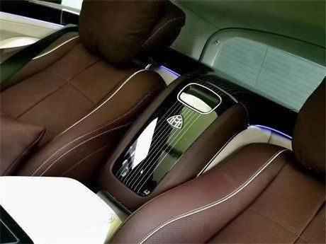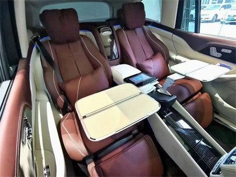 奔驰GLS450升级迈巴赫GLS600方案后排座椅改成了两座座椅,安装带平板控制、无线充电器、小桌板的贯穿长条马鞍,构建长途旅行中恬静的车内氛围及充分放松的乘坐体验。