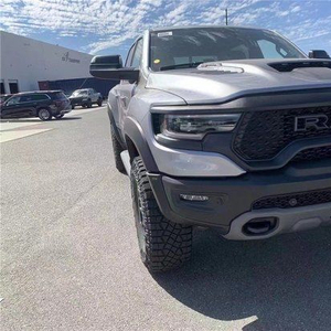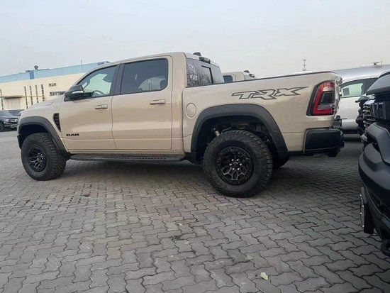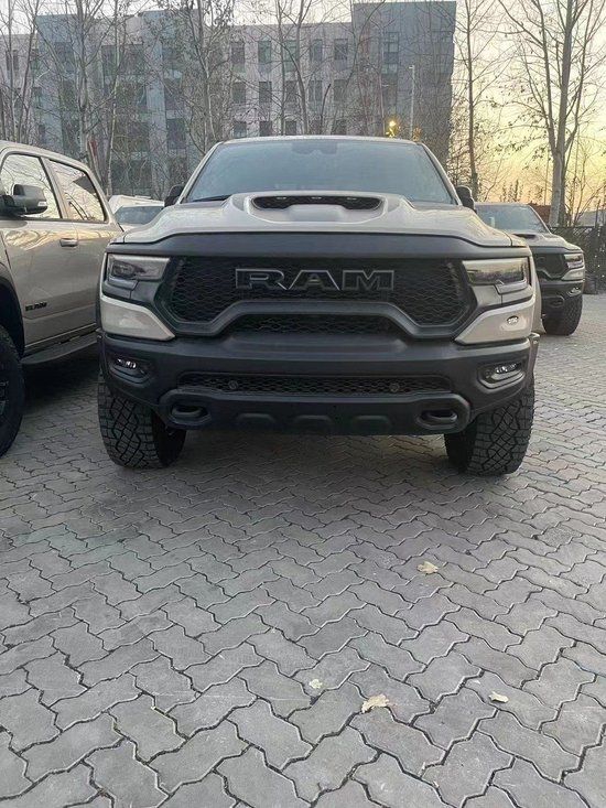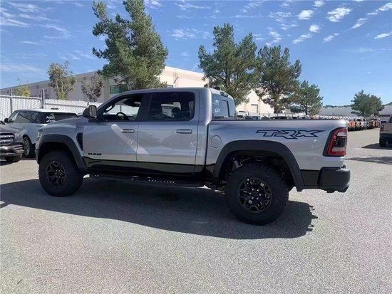 22款道奇公羊霸王龙TRX国六最新款新车传承了道奇Ram家族高大威猛的造型设计,同时细节部分融入了更多高性能元素,包括经过黑化处理的前格栅,引擎盖两侧的黑色进气口,霸王龙 以及为了容纳巨大的机械增压器而设计的通风口等等。此外,新车还配备了视觉冲击力更强的黑色轮眉和外露式的拖车钩,看上去十分霸气。