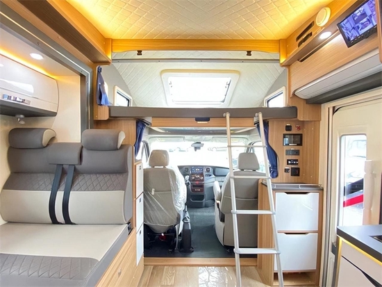 卫浴间紧挨厨房,半吸塑工艺的独立卫生间拥有良好的防水防漏系统,由于内置多面镜子,在灯光的衬托下显得空间格外通透。内部设备也一应俱全,多美达专用坐便器、带防水盖板的电源接口、毛巾架、梳妆镜、淋浴花洒等,可充分满足您与家人在旅途中的洗浴需求。车上配有燃油暖风一体机,可为您24小时不间断供应热水,使您纵享温暖旅途!