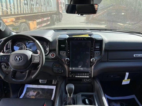 22款道奇公羊霸王龙TRX在内饰部分进一步强化了其高性能版本的形象,中控台和座椅随处可见的TRX标识便是最好的例证。同时,作为道奇家族的旗舰车型,新车还配备了12英寸竖置中控屏幕,除了支持蓝牙、导航和车载Wi-Fi等常见功能,还支持Apple CarPlay和Android Auto手机映射。
