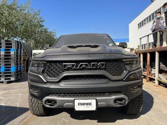22款道奇公羊霸王龙TRX国六最新款新车传承了道奇Ram 家族高大威猛的造型设计,同时细节部分融入了更多高性能元素,包括经过黑化处理的前格栅,引擎盖两侧的黑色进气口,霸王龙 以及为了容纳巨大的机械增压器而设计的通风口等等。此外,新车还配备了视觉冲击力更强的黑色轮眉和外露式的拖车钩,看上去十分霸气。
