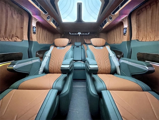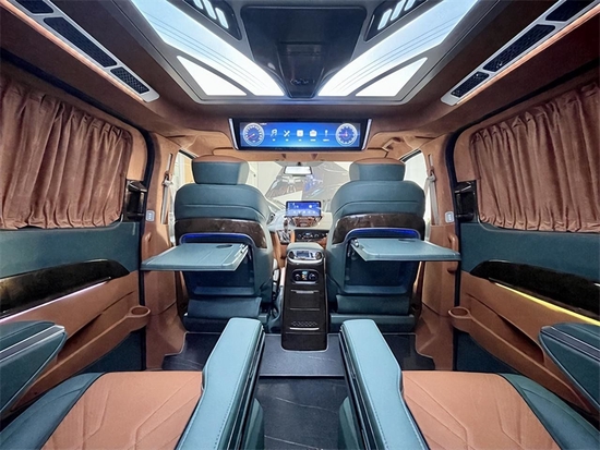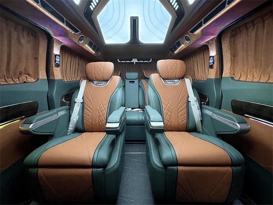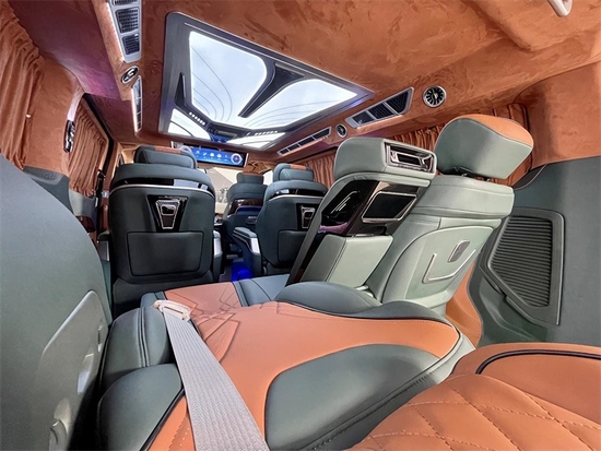 内饰通过灰色和棕色的皮质整车包覆,给人舒适温暖的感觉,他的装饰件和桃木方向盘是他迈入豪华商务车的开始,二排的空间可以说是豪华商务的标配,想要车内整洁,安装磨砂地板是重要环节。极具创意的机甲系高达三色灯光可以任意调节。内饰可以个性化私人定制。