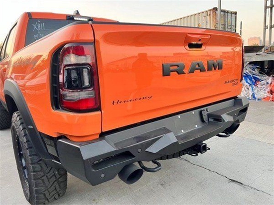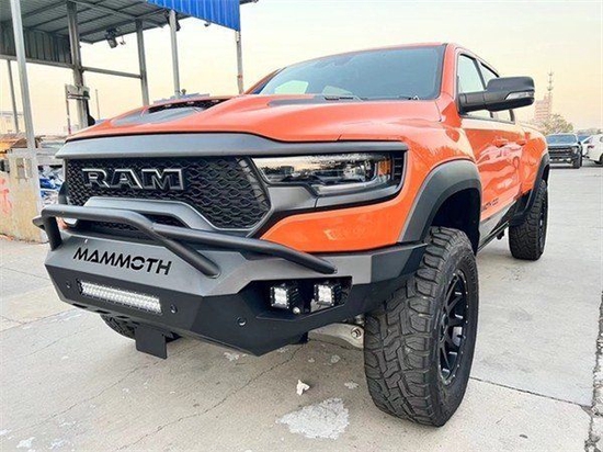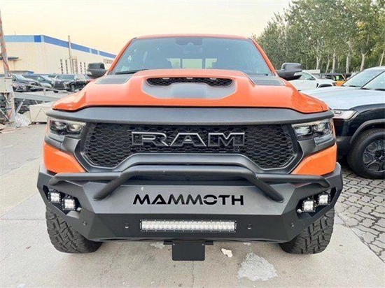 2022款道奇公羊猛犸象传承了道奇Ram家族高大威猛的造型设计,同时细节部分融入了更多高性能元素,包括经过黑化处理的前格栅,引擎盖两侧的黑色进气口,以及为了容纳巨大的机械增压器而设计的通风口等等。