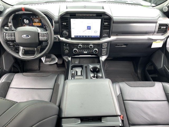 福特猛禽中控台部分辅以银色饰板装饰六指针仪表盘的设计有些后工业时代的复古风格。采用带电冷热功能的可记忆式皮革座椅,头枕四向可调,搭配铝饰条和黑色钢琴烤漆内饰。可电动升降的后窗带隔板和电热除霜功能。