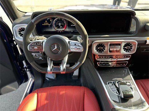 23款奔驰G63豪华精致的真皮包覆提供了足够的舒适性和支撑性,通风和加热功能让乘客免受高温和寒冷的煎熬。中控台多处均采用碳纤维材料覆盖,带彩色TFT显示屏的AMG仪表盘、AMG主菜单和单独的挡位显示器以及采用白色照明的AMG门槛。名贵的选材及精湛的内装令人拍案叫绝。