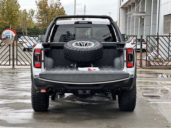 22款道奇公羊霸王龙TRX国六最新款新车传承了道奇Ram 家族高大威猛的造型设计,同时细节部分融入了更多高性能元素,包括经过黑化处理的前格栅,引擎盖两侧的黑色进气口,霸王龙 以及为了容纳巨大的机械增压器而设计的通风口等等。此外,新车还配备了视觉冲击力更强的黑色轮眉和外露式的拖车钩,看上去十分霸气。