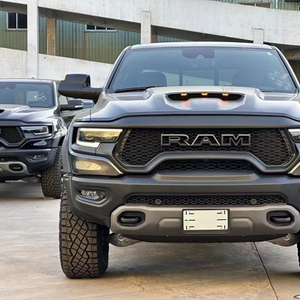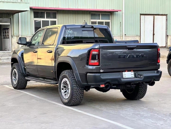 22款道奇公羊霸王龙trx外观设计极具冲击感。前倾式车头,相较中规中矩的家族设计无疑多了几分对路面的侵袭感,眼神中没有透露出一丝的活泼神韵唯一展现出来的只有凶狠。车身非常巨大长宽高分别达到了5.9米、2.2米、2.0米,而且比普通版的Ram皮卡要宽一些,轴距则为3.68米。所有的外观装饰件都采用磨砂黑色依旧是巨大网状进气格栅但是车灯要比老款的Ram皮卡小一些。