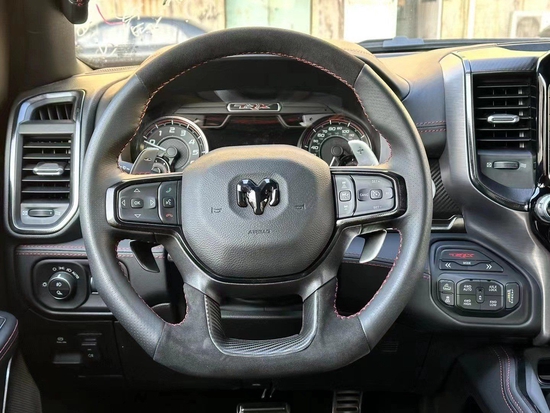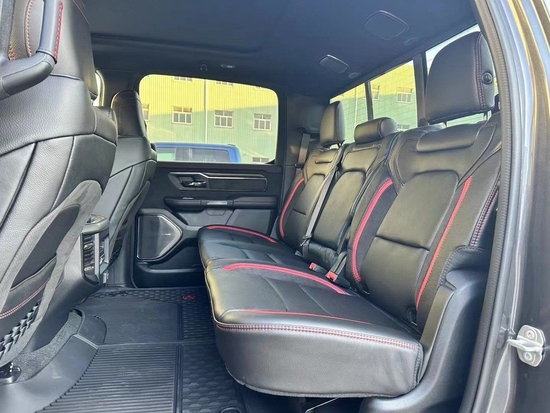 22款道奇公羊霸王龙trx内饰做工则完全摆脱了美式的粗糙感。边缘接缝都处理的很精细,真皮座椅各自独立,配有加热按摩等舒适功能。每个座椅独立配一个操控手柄,各项功能由乘坐者自己控制。道奇公羊皮卡车型全部座椅均采用真皮包裹,前排还配备了十分实用的运动座椅。