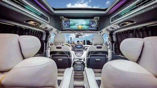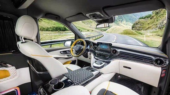 奔驰迈巴赫VS680安道拓版继承了奔驰家族全新的设计语言,内饰风格上跟S系很相似,不过完全是全新的设计,不同S系一气呵成的T字型的中控台,V级车因为MPV的缘故,其实驾驶台的空间是相当的充足。通过一条银色的装饰条巧妙的分割了奔驰的Command系统。一般传统的布局方法,此处应该是变速箱档杆的位置,由于V级车搭载了电子选档杆,集成到了方向盘这个位置,这个地方就由Command取代。并且这个位置也相当符合人机工程学设计,手肘可以轻松的搭在后方的扶手上。