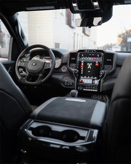 2022款道奇霸王龙在内饰部分进一步强化了其高性能版本的形象,中控台和座椅随处可见的TRX标识便是最好的例证。同时,作为道奇家族的旗舰车型,新车还配备了12英寸竖置中控屏幕,除了支持蓝牙、导航和车载Wi-Fi等常见功能,还支持Apple CarPlay和Android Auto手机映射。
