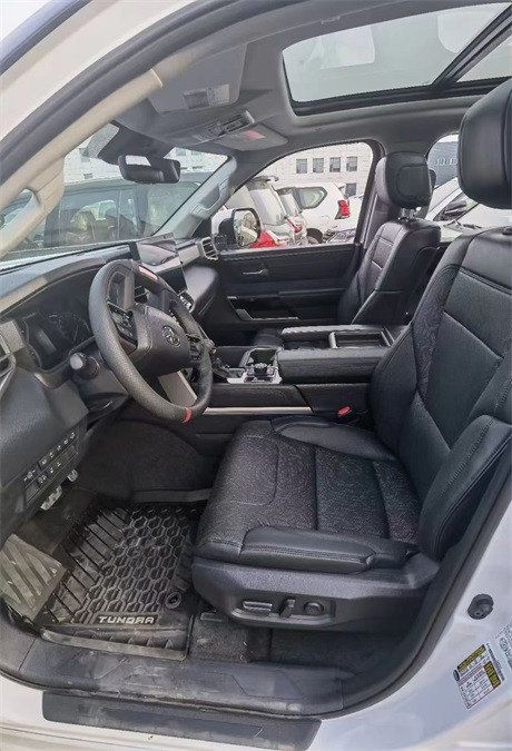 22款丰田坦途座椅提供有皮质包裹,整体的造型也非常宽大,在中央扶手区域的设计上也采用了非常方正的造型设计,并且可以看到前排的储物空间设计还是非常丰富的。