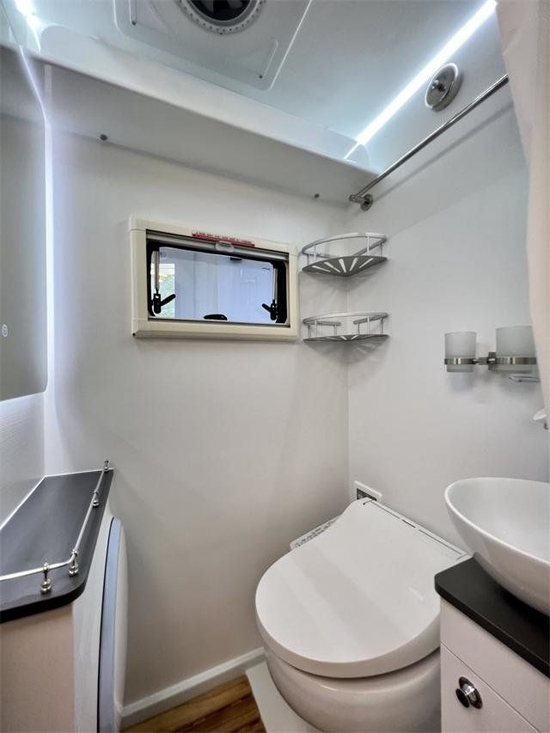 厨房区配有铁灰台面,深水槽,延伸案板,以及米家的电磁炉,上方的微波炉,可以加热食物。配合卡座后方的赛特福德152L双开门冰箱,保证旅居的食品储量。这款车还独立开发了热能回收系统,可以回收发动机余热,空调外机余热,柴油暖风余热,回收的热能可以给水箱进行加热,水不用浪费宝贵的电能再次加热可以直接用来洗澡,零下的时候可以防止水箱结冰,并且热量一直上升可以形成地暖效果,一举三得。