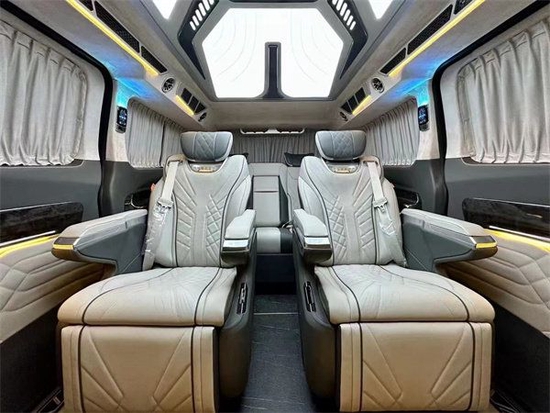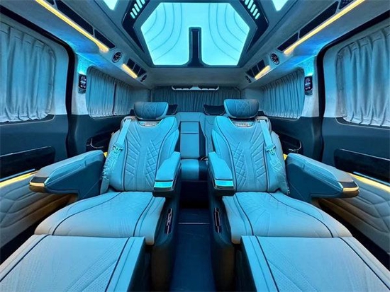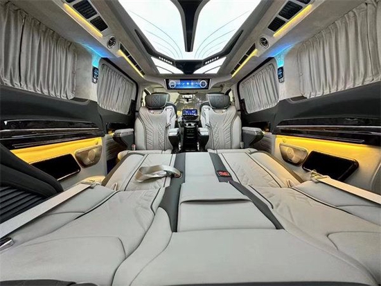 整车在配置上也很是舍得用料,全车都是真皮包覆从驾驶舱的门板到中控台到顶部,到门板到座椅都做了精细化的包覆。门板上的压花走线也非常的工整,体现了整台车子的品质与质感。整车还带有空气弹簧,行驶的过程中更加的平稳。驾驶舱中央扶手冰箱也都配备上了,还有无线充电和杯托。