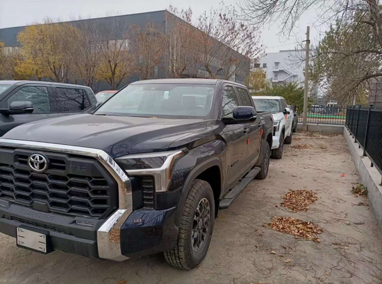 丰田坦途直接提供了有棱有角的车头前脸,大尺寸蜂窝状进气中网搭配镀铬边框处理,两侧泪痕造型LED矩阵大灯视觉效果并不输给福特猛禽 (配置|询价)(配置|询价)。车身侧面看也有了方盒子外观效果,甚至还要熏黑车窗立柱营造出悬浮车顶。黑武士改装风格轮毂搭配原厂越野轮胎,素车就能够实现不错的越野通过性。