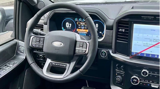 2022款福特猛禽F150Raptor皮卡中控台部分辅以银色饰板装饰六指针仪表盘的设计有些后工业时代的复古风格。采用带电冷热功能的可记忆式皮革座椅,头枕四向可调,搭配铝饰条和黑色钢琴烤漆内饰。可电动升降的后窗带隔板和电热除霜功能。
