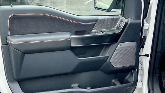 2022款福特猛禽F150Raptor皮卡中控台部分辅以银色饰板装饰六指针仪表盘的设计有些后工业时代的复古风格。采用带电冷热功能的可记忆式皮革座椅,头枕四向可调,搭配铝饰条和黑色钢琴烤漆内饰。可电动升降的后窗带隔板和电热除霜功能。