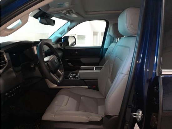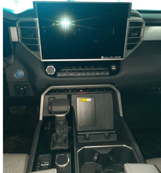 丰田坦途座椅提供有皮质包裹,整体的造型也非常宽大,在中央扶手区域的设计上也采用了非常方正的造型设计,并且可以看到前排的储物空间设计还是非常丰富的。