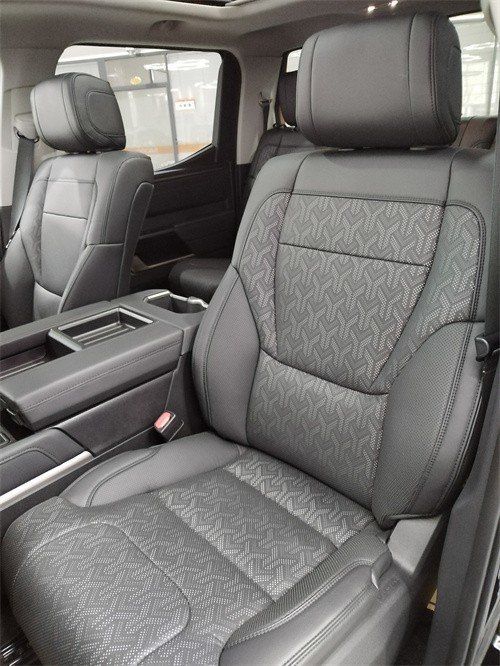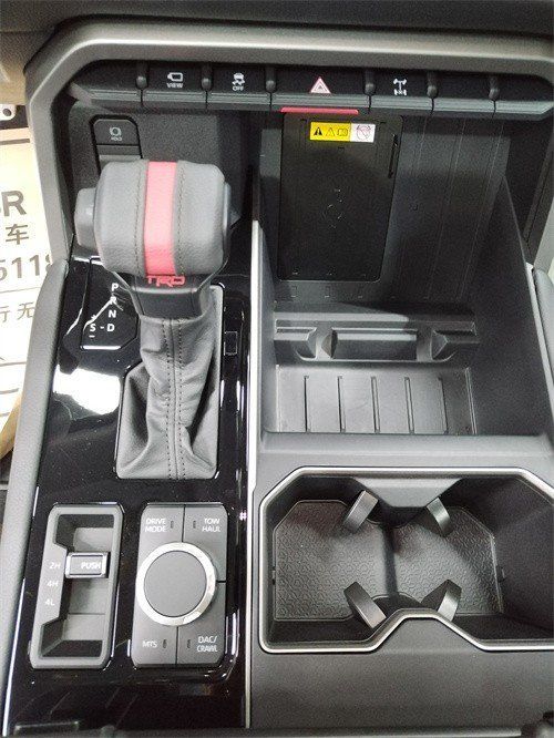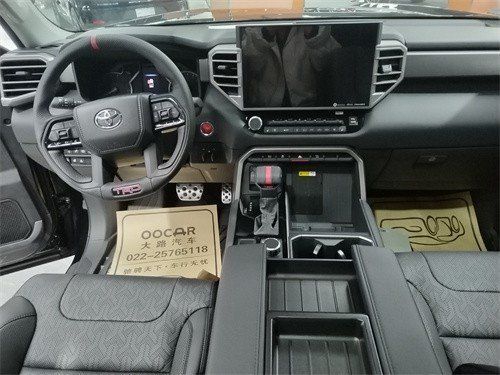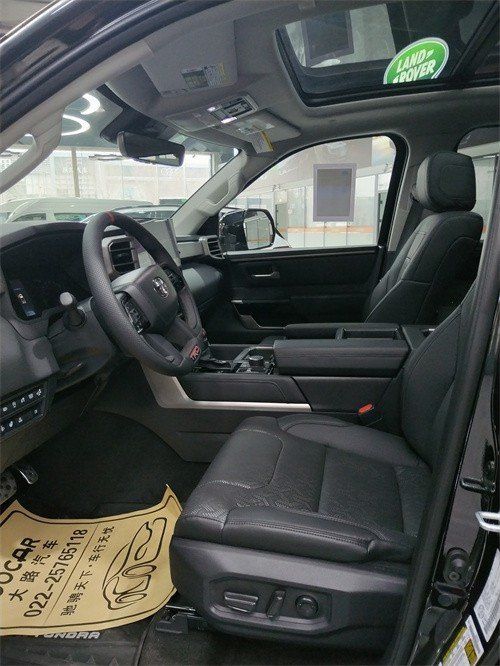 22款丰田坦途3.5TT的座椅提供有皮质包裹,整体的造型也非常宽大,在中央扶手区域的设计上也采用了非常方正的造型设计,并且可以看到前排的储物空间设计还是非常丰富的。