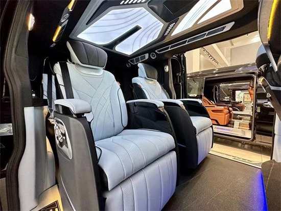整车在配置上也很是舍得用料,全车都是真皮包覆从驾驶舱的门板到中控台到顶部,到门板到座椅都做了精细化的包覆。门板上的压花走线也非常的工整,体现了整台车子的品质与质感。整车还带有空气弹簧,行驶的过程中更加的平稳。驾驶舱中央扶手冰箱也都配备上了,还有无线充电和杯托。