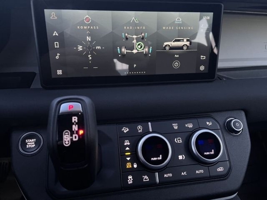 路虎卫士新款内饰相比老款车型有了很大的提升,第一眼看到时确实有被震撼到。四幅式方向盘充满了战斗感,全系标配12.3英寸全液晶仪表盘以及10英寸嵌入式中控屏,在双层中控台之间更是科技感爆棚