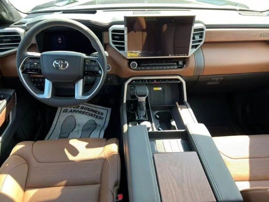 22款坦途 3.5T 混动 1794状态: 现车手续齐配置:1794徽标,实木内饰 棕色真皮座椅,前独立悬挂,方向盘加热,抬头显示,隐私玻璃,电动后窗,前排座椅通风加热,LED大灯,全景天窗,122L大油箱,坡道辅助,三种驾驶模式选择,拖车制动控制,20轮,无线充电,JBL高级音响,动态雷达巡航控制(ACC),紧急转向辅助预碰撞系统,胎压监测 !