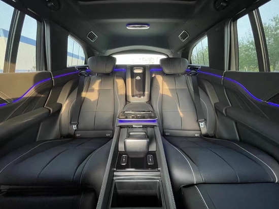 奔驰迈巴赫GLS600提供四座和五座两种布局,其中四座车型第二排独立座椅相比普通版GLS更加靠后,并且带有巨大的腿拖,其后排座椅最大倾斜角度大43.5度,后排腿部空间最大达1.34米。中央由冰箱、控制台、储物空间和手机无线充电台等进行贯穿,呈现出类似于迈巴赫S级 (配置|询价)一样的头等舱设计。奔驰迈巴赫GLS600方向盘、中控台等处都使用了实木、真皮等材质,触感、观感都无可挑剔。同时,新车还配备了该车型专属的64色氛围灯、名为“NO.8 mood”香氛系统和Burmester品高端3D环绕音响系统