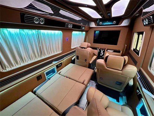 奔驰斯宾特整车核载7人,驾驶舱与后面的商务舱通过隔断隔开,给后面的商务舱提供了私密空间。但又没完全隔开,因为宽屏曲面网络电视是可以升降的,降下来之后,前后舱可以直接沟通。一体式的吧台隐藏着两个翻折式座椅,可供航空椅上的老板放脚用,也可以临时开会对坐用。对坐当然少不了收缩式的小圆桌。