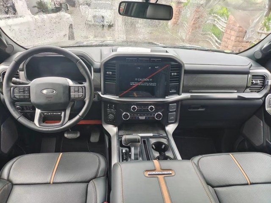 福特F150内饰采用独特的中控台和门饰板面漆和真皮包裹的方向盘。中控台部分辅以银色饰板装饰,六指针仪表盘的设计有些后工业时代的复古风格。采用带电冷热功能的可记忆式皮革座椅,头枕四向可调,搭配铝饰条和黑色钢琴烤漆内饰可电动升降的后窗带隔板和电热除霜功能。
