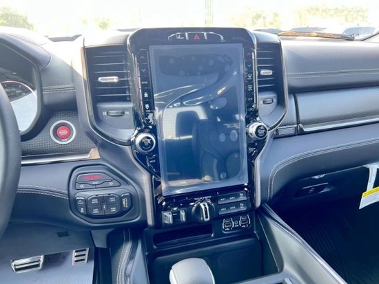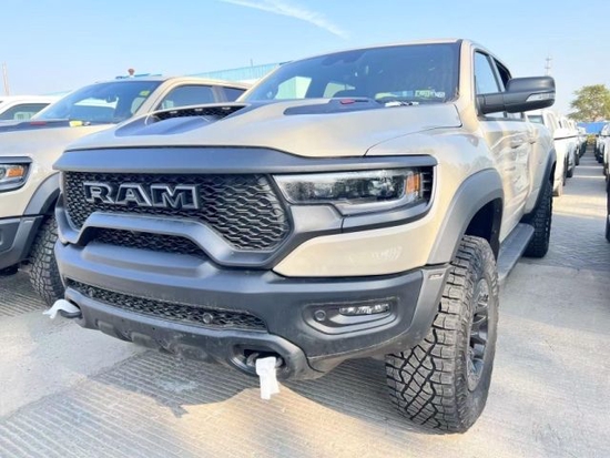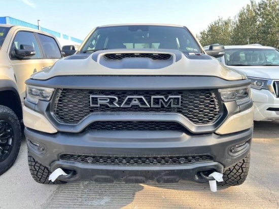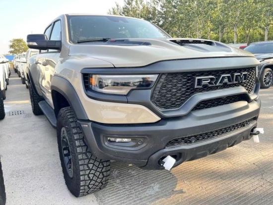 道奇公羊霸王龙TRX传承了道奇Ram家族高大威猛的造型设计,同时细节部分融入了更多高性能元素,包括经过黑化处理的前格栅,引擎盖两侧的黑色进气口,以及为了容纳巨大的机械增压器而设计的通风口等等。此外,新车还配备了视觉冲击力更强的黑色轮眉和外露式的拖车钩,看上去十分霸气。