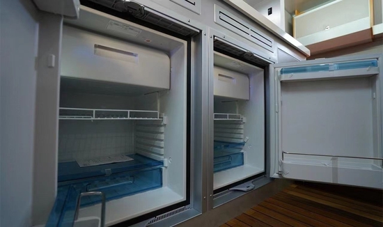 进入乘客门左手边是厨房所在区域,料理台台面集成带盖一体式水槽+水龙头及西门子微波炉;周围收纳空间便于存放厨余用品;其它配置有驾驶室30L英得尔车载冰箱、抽油烟机、大宇3KG洗衣机(带烘干)、伟巴斯特暖风加热器(净水箱、灰水箱、黑水箱防冻专用)、160L嵌入式多美达分体式冰箱(单个80L)、四路监控、一氧化碳、烟雾报警器等。