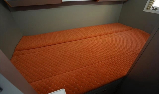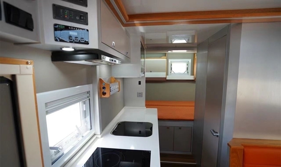 后置横床拓展后可变成一张双人床,满足一大一小睡眠使用,同时配备USB接口,220V/12V电源插座,床头阅读灯;橙色床垫支撑性好,也赋予尾部空间更多的活力。上方收纳空间也非常丰富,半开式储物槽及吊柜内部分别可存放日常生活用品、换洗衣物及被褥等床上用品。床板下方另有超大储物空间,对于常见C型房车来说,熟悉的用户也不会很陌生,反而贴心的同时也拉进了人与车之间的距离。