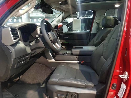 丰田红杉内饰的实用性与空间利用率在这代红杉身上均得到提升,坐进车内,第一感受就是大,前排的两个大尺寸的真皮座椅,自带打孔透气皮料,四幅式多功能方向盘,握在手里的质感不错