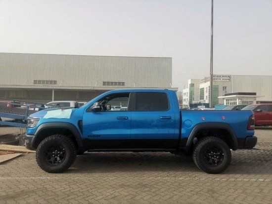 配置:蓝色金属漆 双色漆面 TRX2级包 高级安全包 货厢包 拖车牵引总成 双窗格全景天窗 Mopar防石撞击梁 TRX引擎盖贴花。