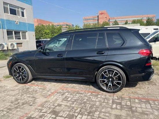 22款宝马X7车身侧面上方配有黑色行李架,前翼子板下方为长条状空气导流槽,腰线较为低矮且呈上扬之势,选用21英寸双五辐式拼色轮毂。车尾造型方正,LED尾灯组与粗壮的银色饰条贯穿相连,采用上下分段式电动尾门,排气采用双边共四出式布局,保险杠下方两侧配有大尺寸镀铬尾喉装饰。