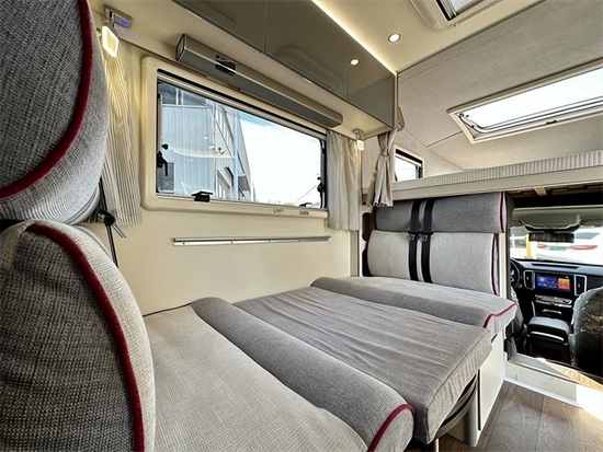 驾驶室上方则是额头双人床,为拓展设计,空间更为宽敞,拓展后的床位尺寸为1.7*1.95米,完全满足两个人睡卧,在床位的顶部为天窗设计,左右两侧为推拉窗,为内部提供了充足的光线以及新鲜的空气,床位处配有充电插口、阅读灯等,满足照明和充电的需求,使你的睡眠环境更加舒适方便。