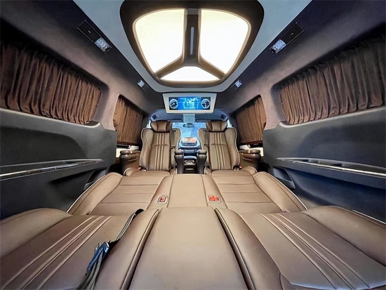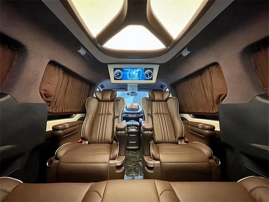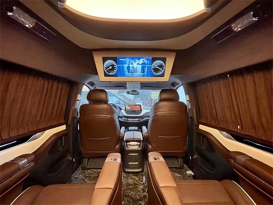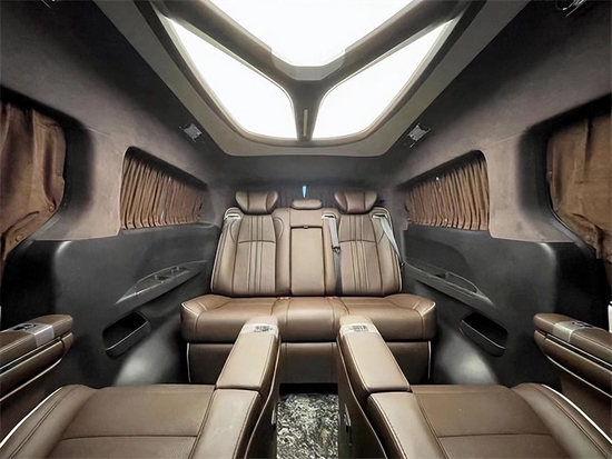 车内采用麂皮绒的软包加上星盾天幕顶灯,整车在看不到的地方,比如四周全部做了隔音的处理,窗户上都加装的是高级私密窗帘,既可以避免阳光的直接照射,维护车内的一个用车环境,也可以很好的保护我们车主的隐私。