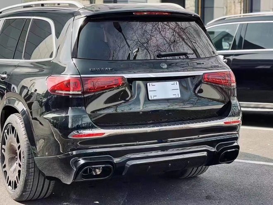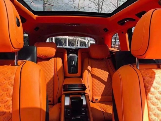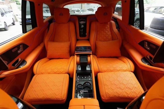 奔驰GLS450改装升级迈巴赫和巴博斯后排座椅改成了两座座椅,安装带平板控制、无线充电器、小桌板的贯穿长条马鞍,构建长途旅行中恬静的车内氛围及充分放松的乘坐体验。
