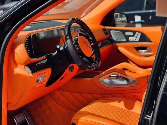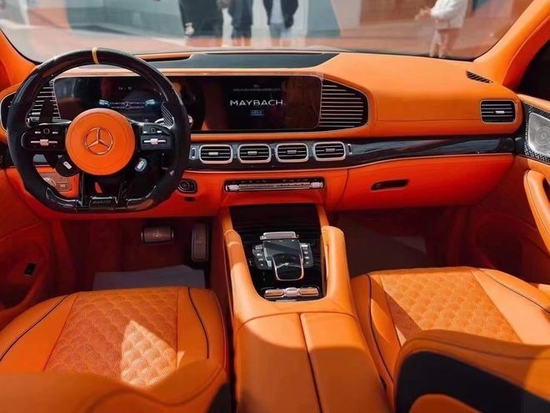 奔驰GLS450改装升级迈巴赫和巴博斯内饰整体皮饰改成了红米色的设计,替换了钢琴黑条纹桃木饰板,桃木方向盘,加装了HUD抬头显示系统,主机系统也刷了迈巴赫的开机画面,车内随处可见的迈巴赫标志,打造无出其右的考究质感。