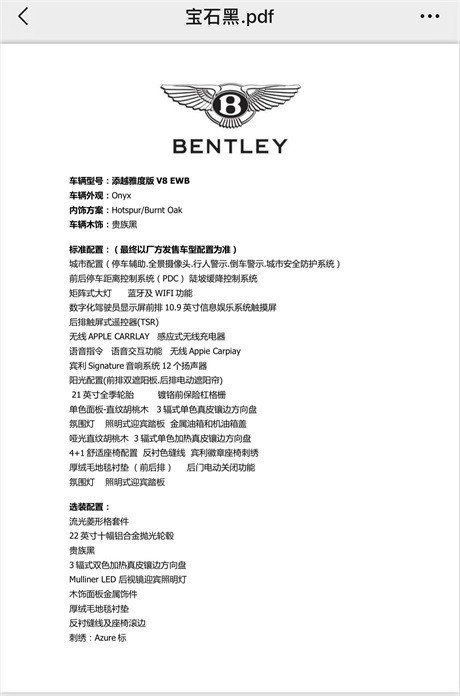 23款宾利添越加长动力部分,搭载的依然是一台4.0T V8双涡轮增压发动机,最大功率404kW(549马力),峰值扭矩770N·m。搭配一台8AT变速箱。官方建议加98(当然了),不过应急情况下加一点95也是可以的。销售经理:张女士 18502224231 微信同步悬架部分采用了前双叉臂/后多连杆式独立悬架,并搭配了空气弹簧。同时为了应对加长轴距对转弯半径的影响,宾利为添越EWB车型配备了后轮主动转向系统,可将转弯直径缩小至11.8米。