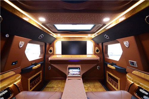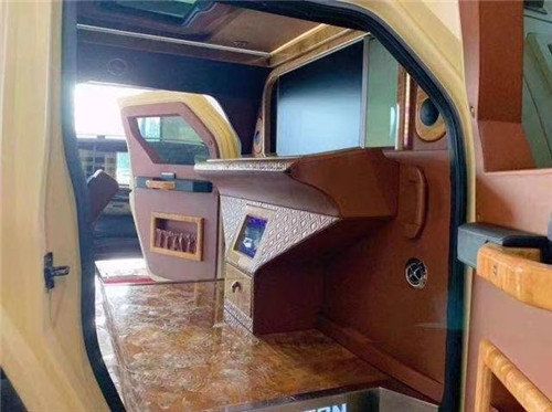 内饰方面:经过高档双色真皮重新包裹,搭配木纹饰板点缀,使得原本就宽敞霸气的内饰更显豪华。细节方面,乔治巴顿车身侧面延续了粗犷的设计风格,外跑的轮眉、见棱见角的车门以及其本身超长的轴距尺寸,看上去就不是好惹的。