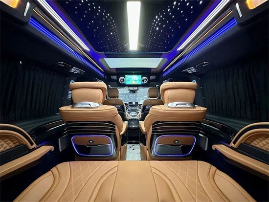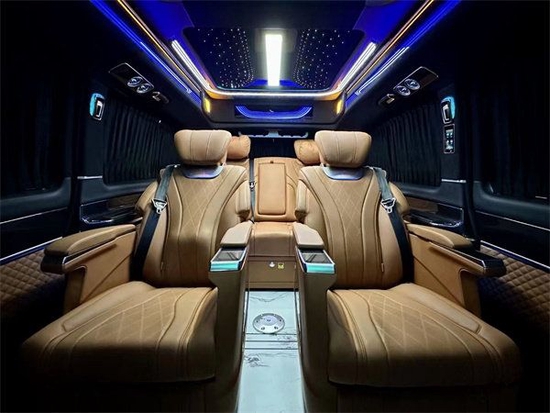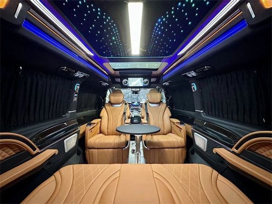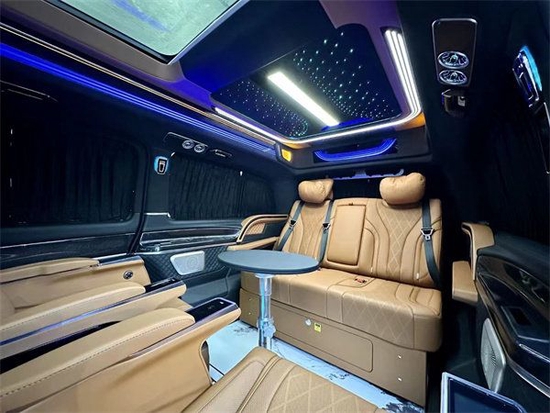 加上第二排座椅旋转形成的布局,完全就是一个豪华办公室,再加上立体环绕的音响系统,半隔断高清互联网液晶电视,两侧个性化定制的侧墙在车内进行商务洽谈也不会显得沉闷。最重要的是第三排还可以一键放平成一个豪华大沙发床,为车内人员提供一个非常舒适、私密的休息环境。