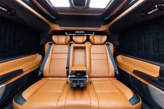 航空座椅棕色全真皮包覆,流线型设计,菱形网格式针缝,享受科技与设计的全新结合。电脑集成控制系统让所有操作尽在指尖一触即发,休闲与办公同样重要。航空座椅和沙发床成了标配,功能强大又多。通风,旋转,按摩,加热,腿托,让乘坐的枯燥也成为了消遣。顶部的宫格顶灯更是有多种颜色随意切换。