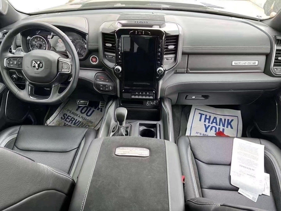 道奇公羊霸王龙在内部设计上还是延续了美式那种比较粗犷的风格,规整的中控台设计看上去比较死板,但丰富的配置会让你不由得为其称赞,中控台的设计简洁硬派,符合公羊的气质,仪表盘底边有花纹,则更加凸显了这款车的文雅性,软性材质的仪表台设计,摸上去手感非常舒服,并无些许生硬之处。
