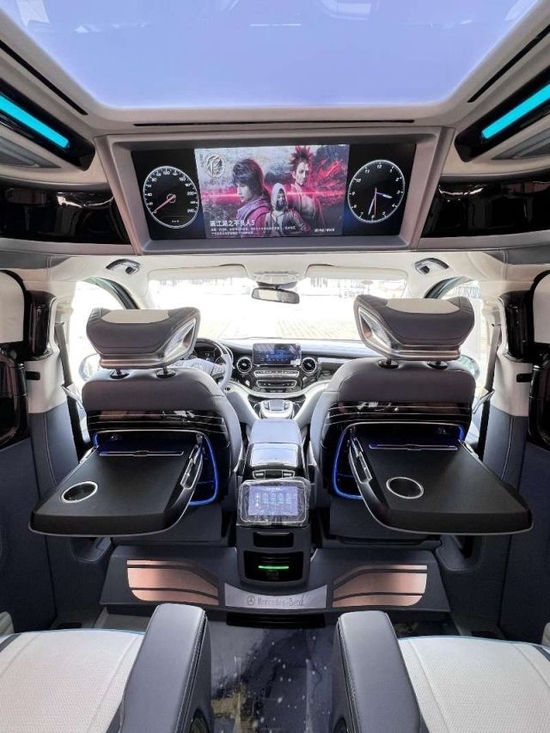 奔驰V250 配置:长轴,高顶,九速, 空悬气挂,经典巴迈赫大包围,车晴窗雨挡片亮装饰条,奔迈驰巴赫三眼大灯,熏黑款LED尾灯,门手把镀铬件;后不杠锈钢饰板;前踏门步全覆盖纤碳维饰板;中踏门步全盖覆碳纤维饰板;电尾动门;迈巴飞赫轮轮毂;仪表台nappa真包皮覆;方向水盘转印真皮包覆;仪台表水转印;门饰板nappa真包皮覆;座椅背靠无线充电、杯小托桌板;新迈款巴赫一体冰化箱中扶央手箱;流豪线华型二休排息踏步;触屏控控制系统;顶部一体设式计;侧真墙皮包覆;手窗动帘;贵宾强区化隔隔音热处理;贵区宾整体哑耐光磨地板;前DVD大导屏航主机;专整业体定制线束;车辅内助,电系统;强石化英玻璃顶灯;正驾副驶门控主8副8电调动节;正副驶驾座椅皮真包覆;贵区宾前排两个立独八向电真动皮座椅加带热、通按风摩、旋座转椅,蓝牙音头箱枕;贵宾后区排424独立风通加热按带摩电动拖腿座椅