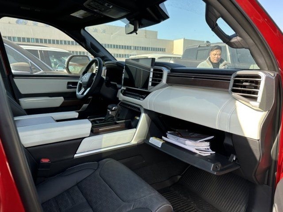 2023款丰田红杉3.5TT顶点版 配置:7座、全景天窗、22寸铝合金轮毂、前排座椅通风 加热、14扬声器JBL高级音响、Softwx装饰双拼色座椅、360环车影像、抬头显示、蜂窝式金属镀铬中网、LED大灯、日间行车灯、LED雾灯、120V/400W后座电源插座、三区空调、方向盘加热、14英寸中控大屏、五种驾驶模式 空气悬挂