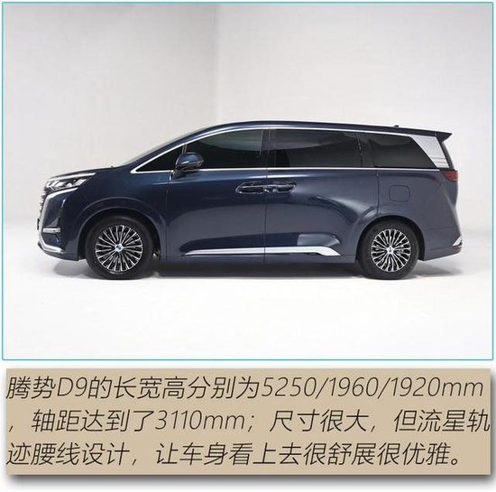 动力方面,腾势D9采用了DM-i混动与纯电两种动力,其中DM-i两驱版本NEDC纯电续航190公里,综合续航达1040公里,亏电油耗为6.2L/100km;DM-i四驱版本NEDC纯电续航180公里,综合续航970公里,亏电油耗为6.7L/100km。纯电版本的CLTC续航超过了600公里。