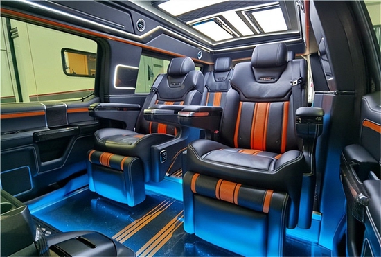 二排两张采用真皮软包的航空头等舱座椅,选用进行加宽,下沉处理的坐垫搭配脚托腰托以及三档的通风、加热、按摩等功能让您享受头等舱级别的乘坐感受;并且三档的记忆功能能够让您在乘坐时仅需一键就能调整到最适合您的乘坐姿态。同时整车做了三层的隔音、降噪处理,搭配车内的隐私窗帘设计,让您在出行时有一个静谧、隐私的乘坐空间!